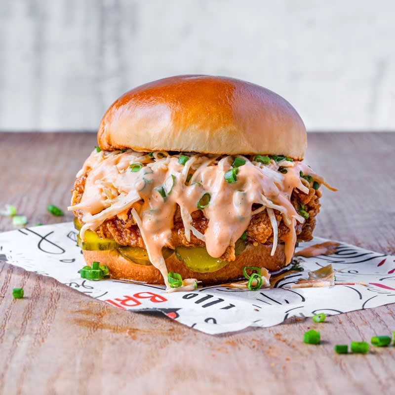 Buttermilk fried chicken, pickles, coleslaw, and mayo on a brioche bun